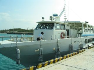 | ラッキー、石垣から折り返しじゃなくて直接竹富に入れるから、時間・船賃の節約になるぞ。 (大原港14:40→竹富港15:15 \1,410-) 右は竹富港に着いたサザンドリーム号。 |