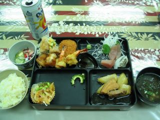 | 夕食の時間です。憩いの場にオリオンビールの自販機があるので買い放題(hi)です。 夜、憩いの場でゆんたくしていると若い衆が自販機にビールを買いに来たりします。 |