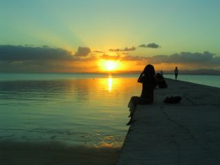 芸能は明日のお楽しみに。西桟橋に夕日を見に行きましょう。これは西を守るスンマシャー。 中央の奥が「そば処竹の子」さん。 |