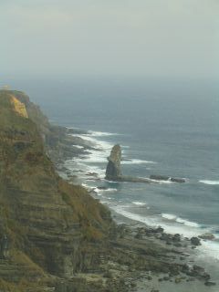 これは立神岩、海にそそり立つ神様の岩です。今日はちょっと雲が多いです。時計の文字盤にたとえると4時の位置。 | ||||||||||||||
