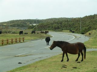 もいちど、6時の方角、比川に戻って西崎を目指しましょう。 途中、道端にはウシさんが放牧されています。 |