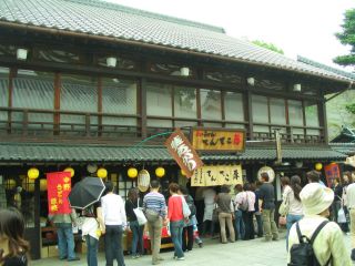 | 大門をくぐると、五人百姓が飴を売っています。境内で営業を許される唯一(唯五?)のお店です。 | ![]() |