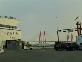 | フェリーの向こうに見えるのが名港トリトン、日本でも有数の斜張橋です。 | ![]() |