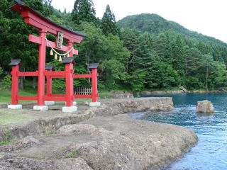 湖畔の御座石神社には真っ赤な鳥居があります。 |