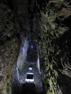 | 遊歩道を下ってくる途中にも間歩があります。全部で600を超えるそうです。この間歩は上の坑道から鉱石を掘って、下の穴から湧き水を排水する仕組みだそうです。 | ![]() |