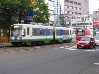 夕食に出撃。 おお、ここ福井にも路面電車。左が770型で右が880型、かな(福井鉄道)。 |