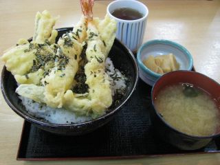 | 看板の塩天丼(上)(\780-)+お味噌汁(\100-)。 |